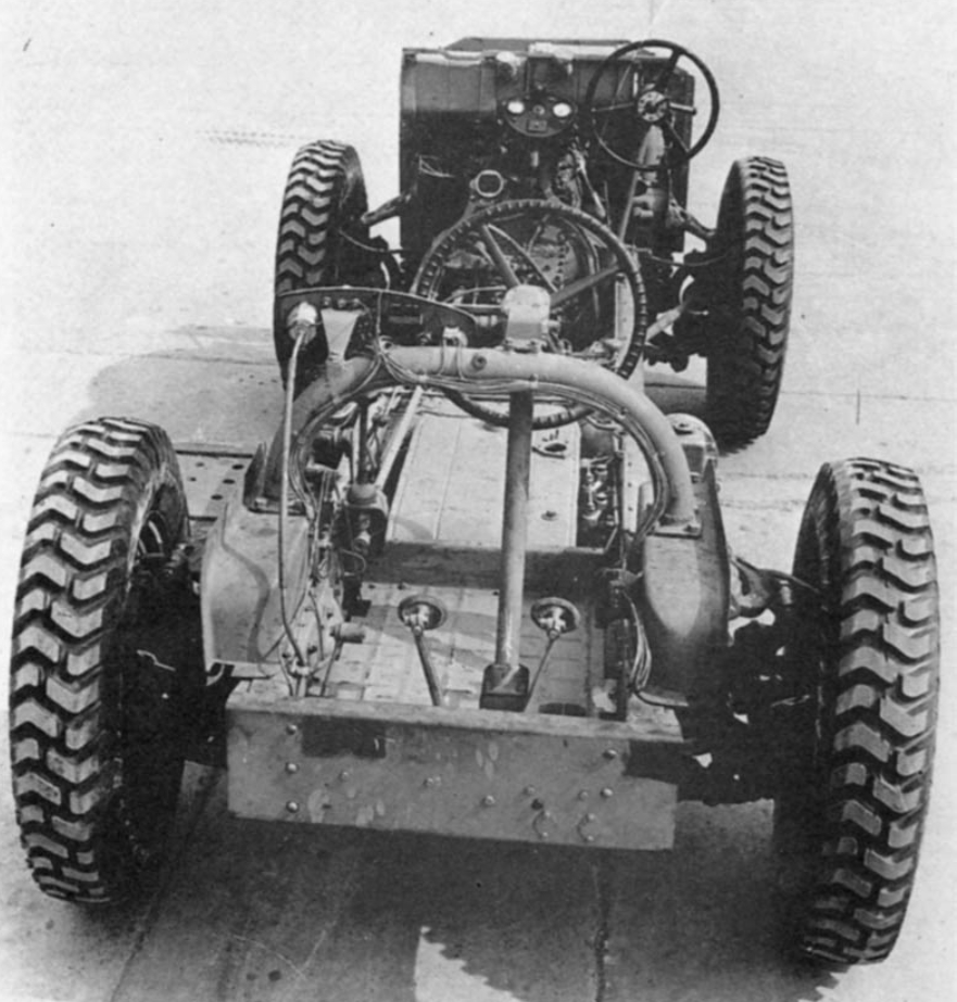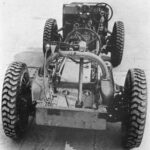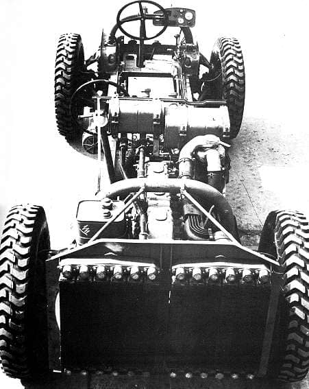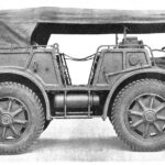 Mobility was the vehicle’s greatest strength, featuring a four-wheel-drive (4WD) system with independent shock absorbers on every wheel. Uniquely, both the front and rear axles were steerable. To further enhance its « all-terrain » credentials, the side-mounted spare wheels were designed to rotate freely, acting as auxiliary rollers to prevent the hull from bottoming out when traversing steep obstacles or ridges.