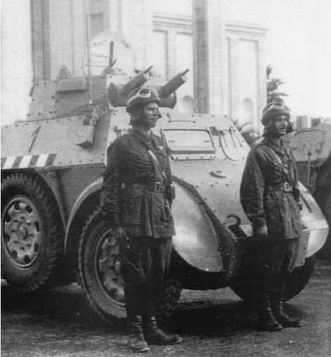 Distinguishing Marks: Following a tragic friendly-fire incident on the first day of the war involving older armored cars, all PAI ABs were painted with large Italian flags on the front and sides for rapid identification.