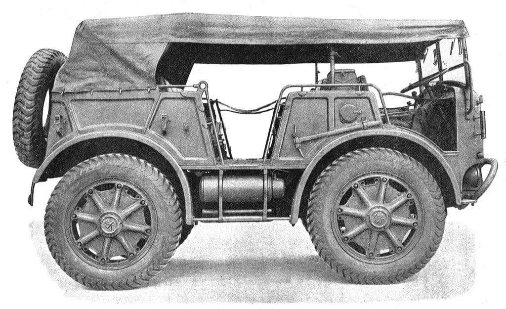 The army model had a fairly sloped front armor and unprotected spare wheels; it was registered as Test TO.64. Compared to the wooden mock-up, the headlights were now protected and the engine hatches had received ventilation grilles.