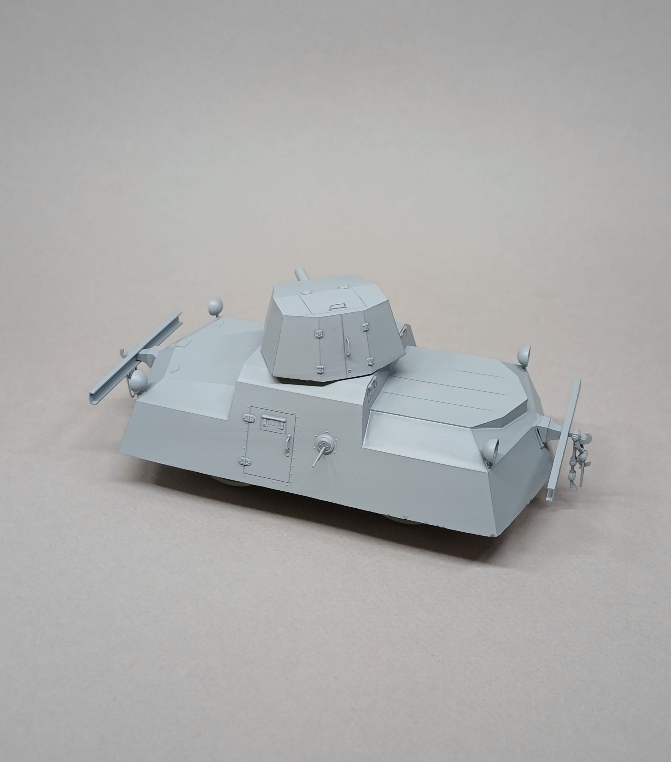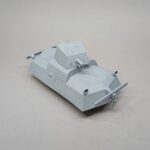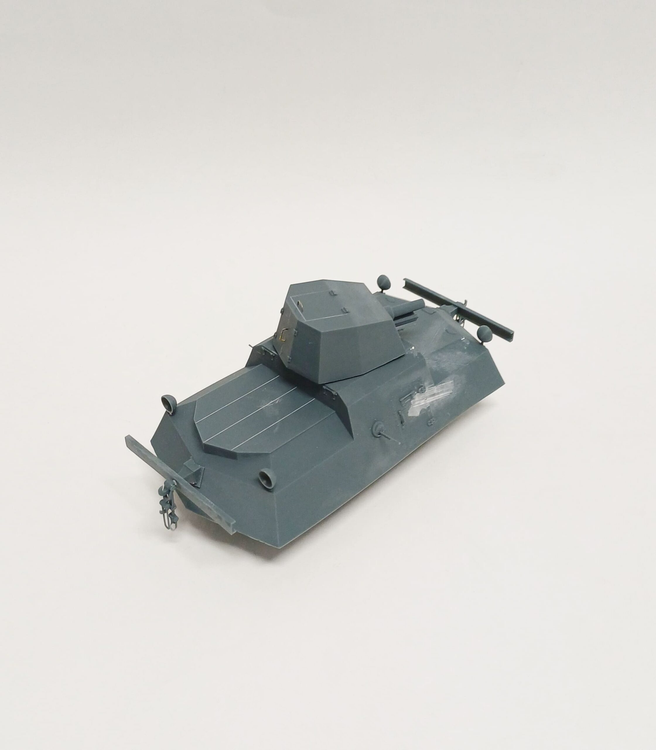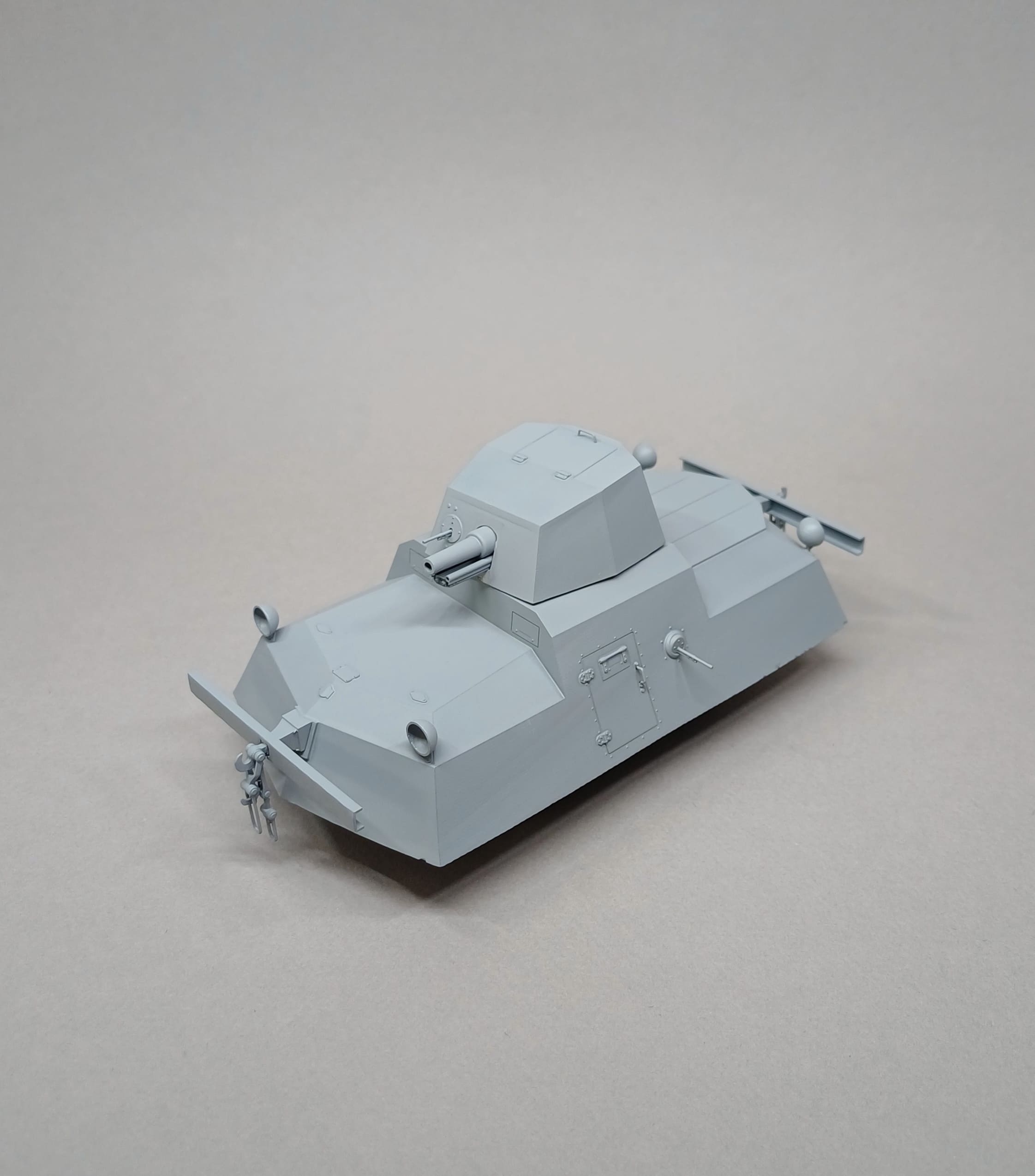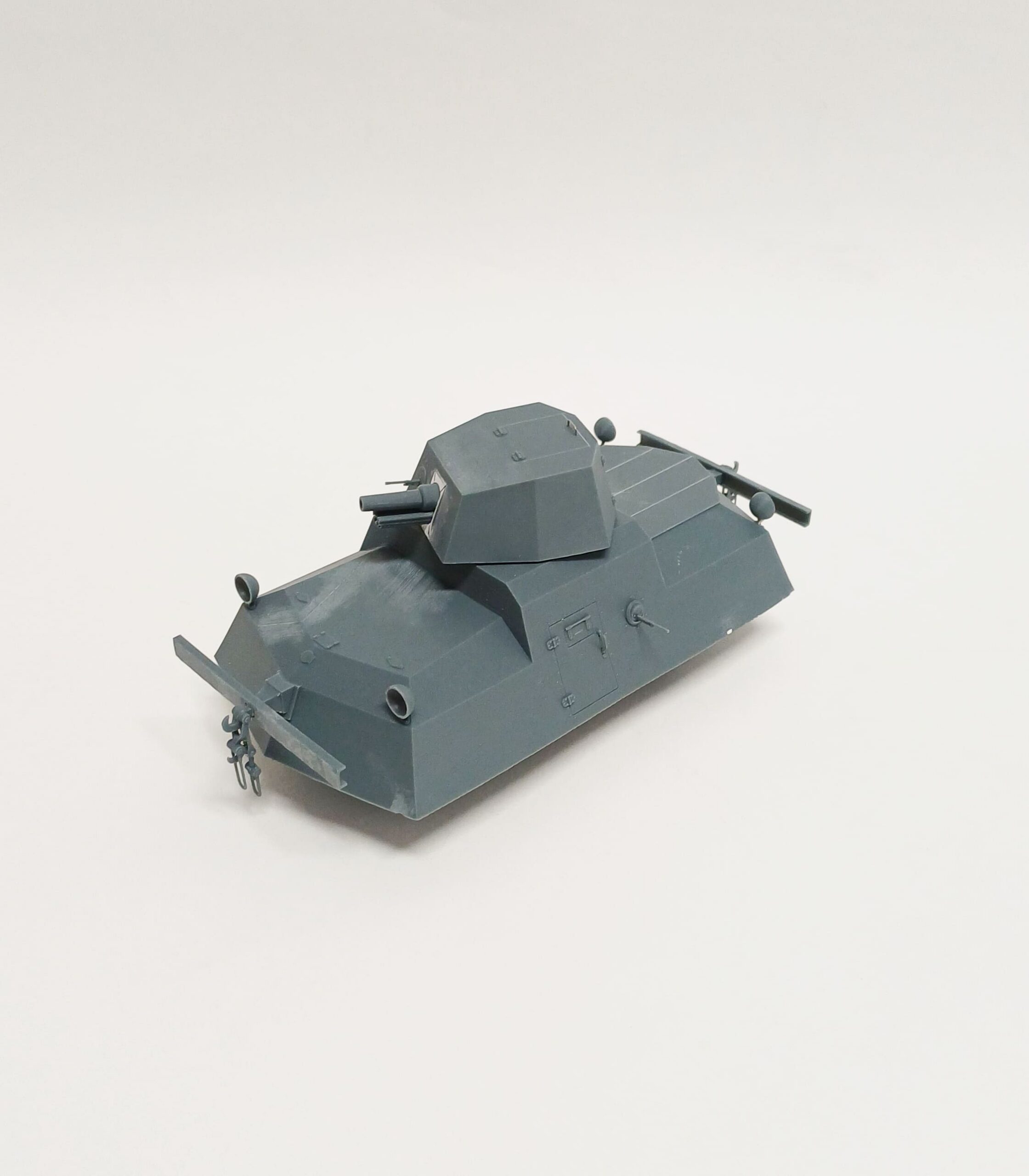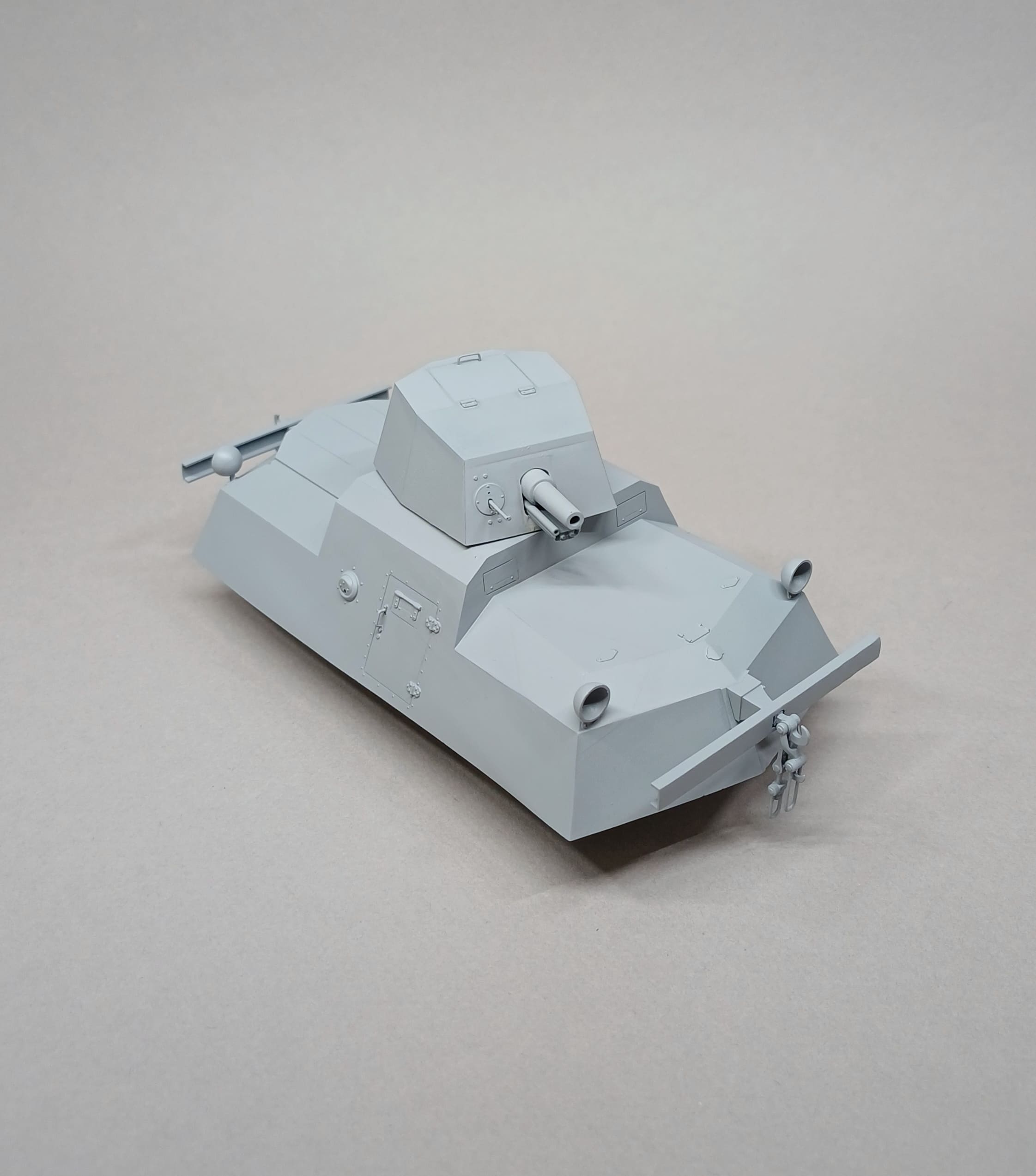 Landshipmodeling recently released the Soviet D-37 and DT-45 railcars. Landshipmodeling is an American brand that offers .stl files so you can 3D print their models yourself. The advantage is getting the files at a very low price; the disadvantage is actually being able to print them. Here’s the link to their website: https://landshipsmodeling.com/collections/digital-products. I’m certainly not a printing pro, but overall, it went pretty well, with a few minor flaws that I think I’ve corrected. There are very few parts to print because it’s a fairly basic vehicle: two hull halves, the turret, the four headlights, the machine guns, the door handles, the front and rear hitching system (modified), and that’s it. The only correction I made was to the gun mount, which is initially just glued onto the turret and therefore remains fixed. I also re-engraved some lines that weren’t deep enough.