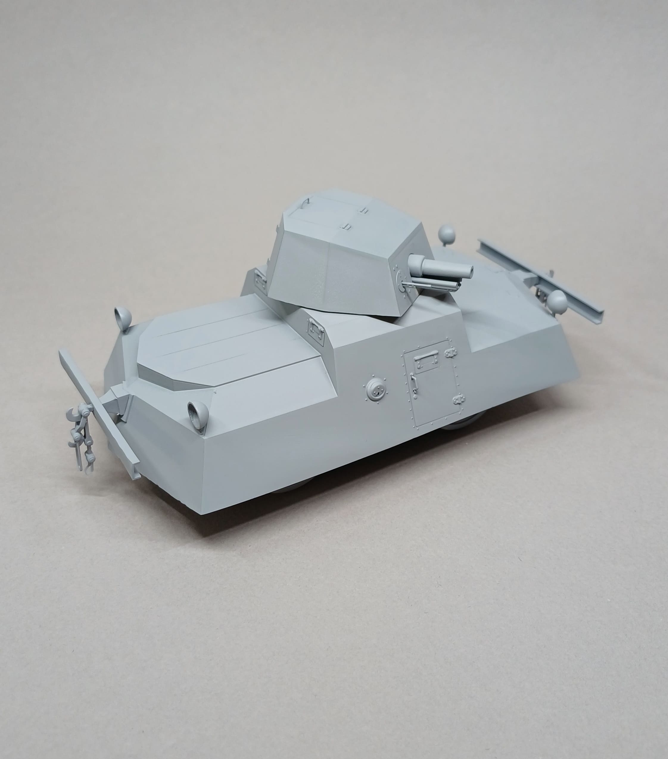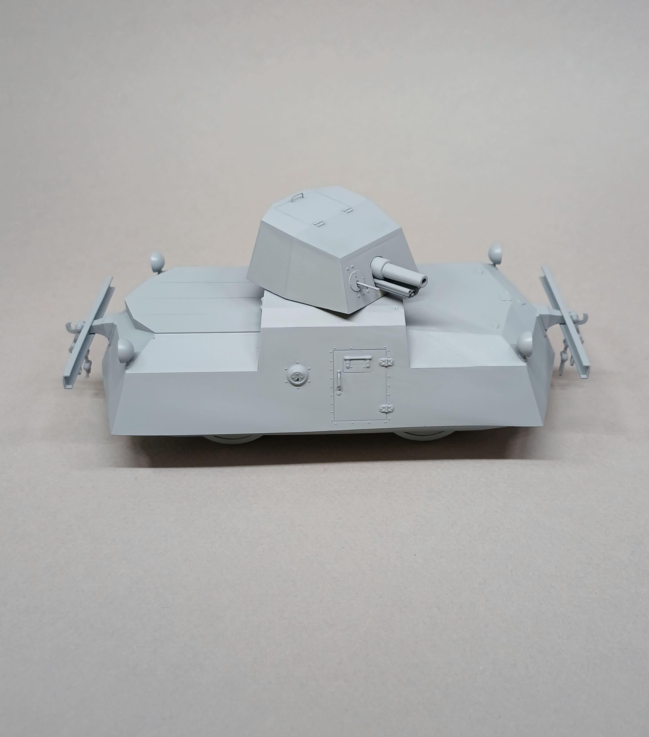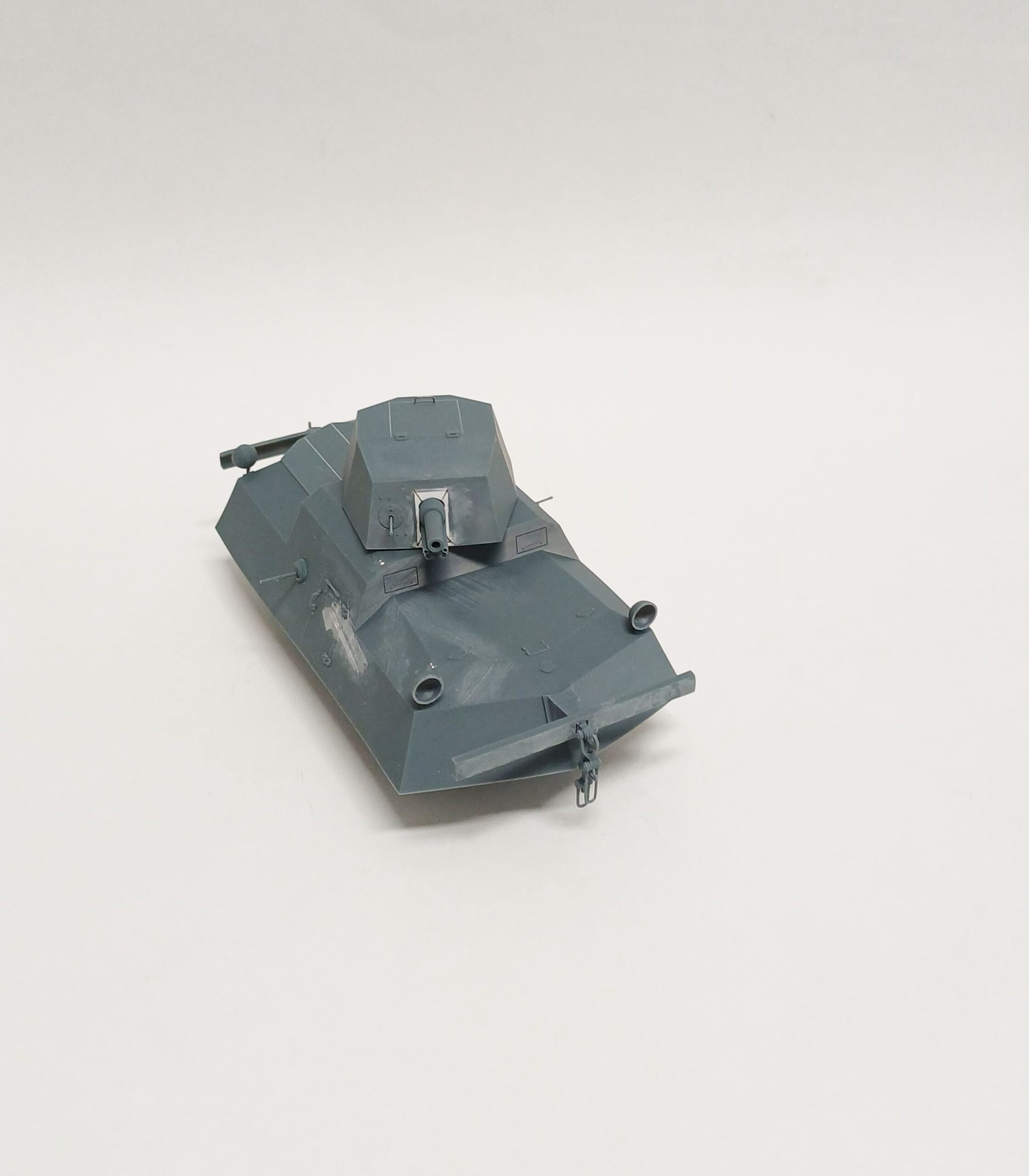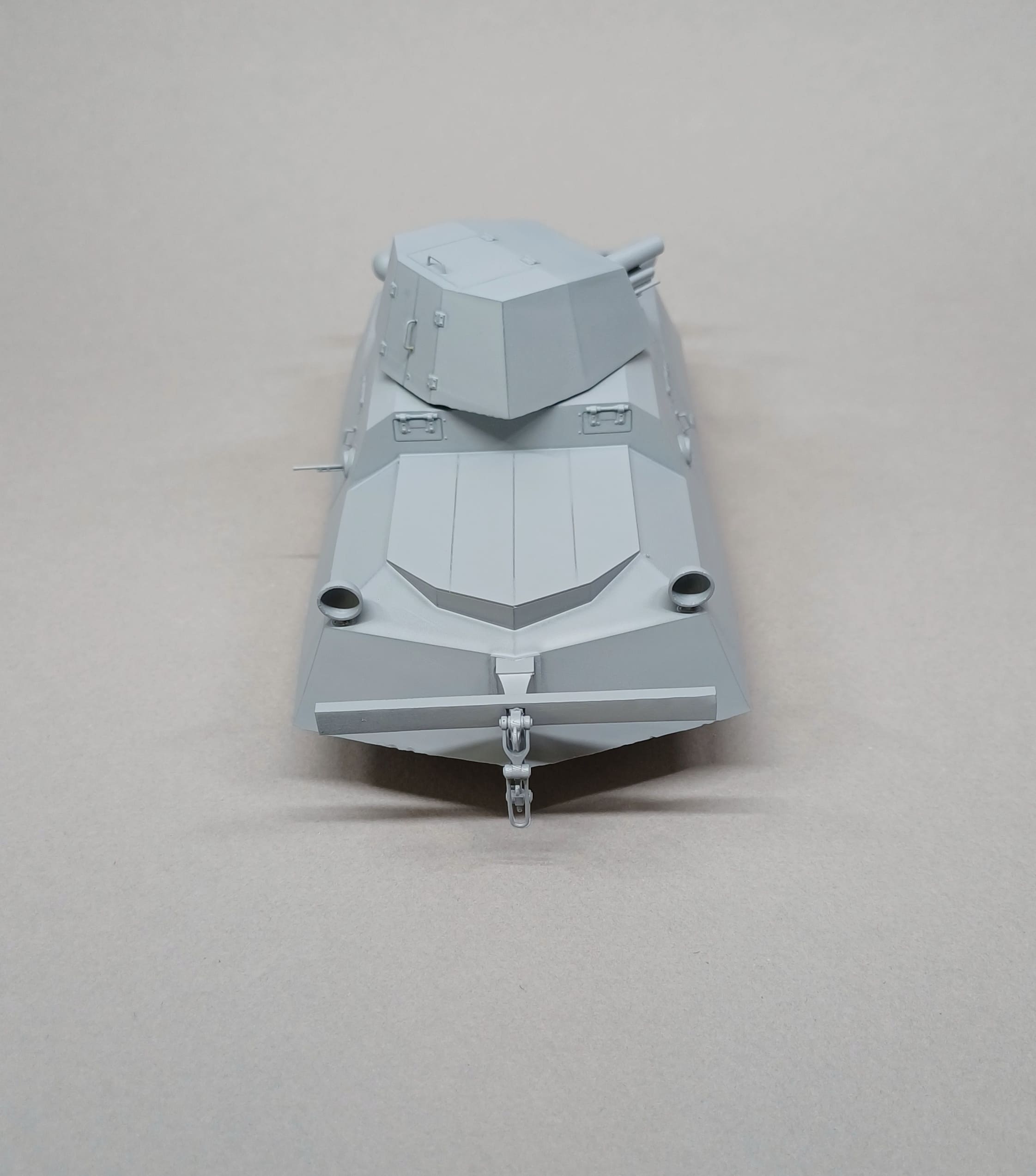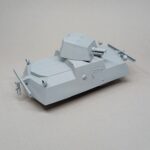 Landshipmodeling recently released the Soviet D-37 and DT-45 railcars. Landshipmodeling is an American brand that offers .stl files so you can 3D print their models yourself. The advantage is getting the files at a very low price; the disadvantage is actually being able to print them. Here’s the link to their website: https://landshipsmodeling.com/collections/digital-products. I’m certainly not a printing pro, but overall, it went pretty well, with a few minor flaws that I think I’ve corrected. There are very few parts to print because it’s a fairly basic vehicle: two hull halves, the turret, the four headlights, the machine guns, the door handles, the front and rear hitching system (modified), and that’s it. The only correction I made was to the gun mount, which is initially just glued onto the turret and therefore remains fixed. I also re-engraved some lines that weren’t deep enough.