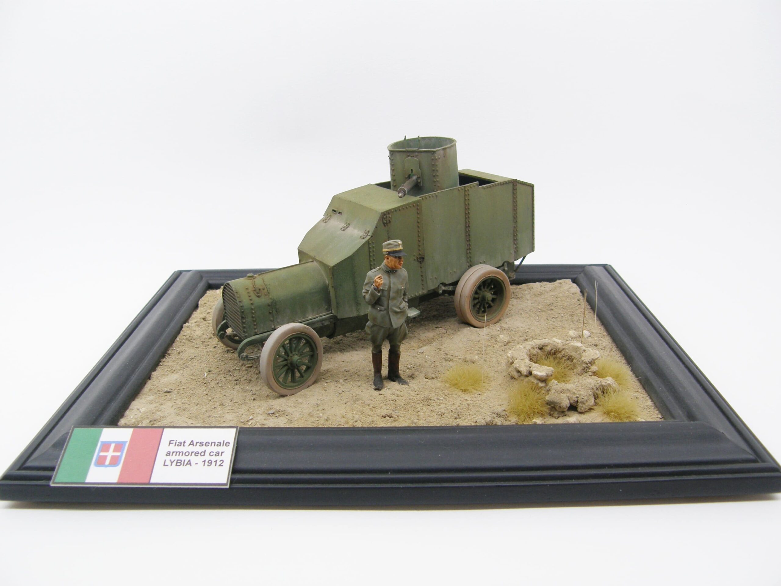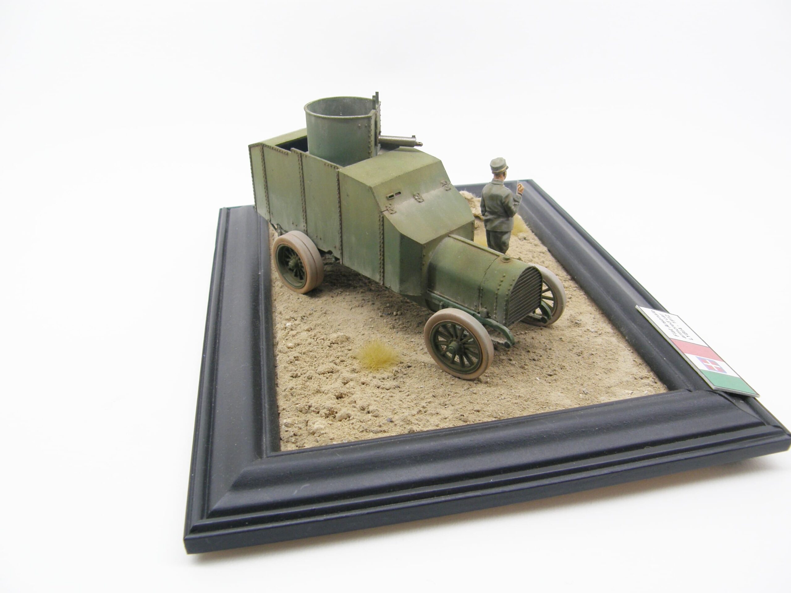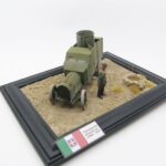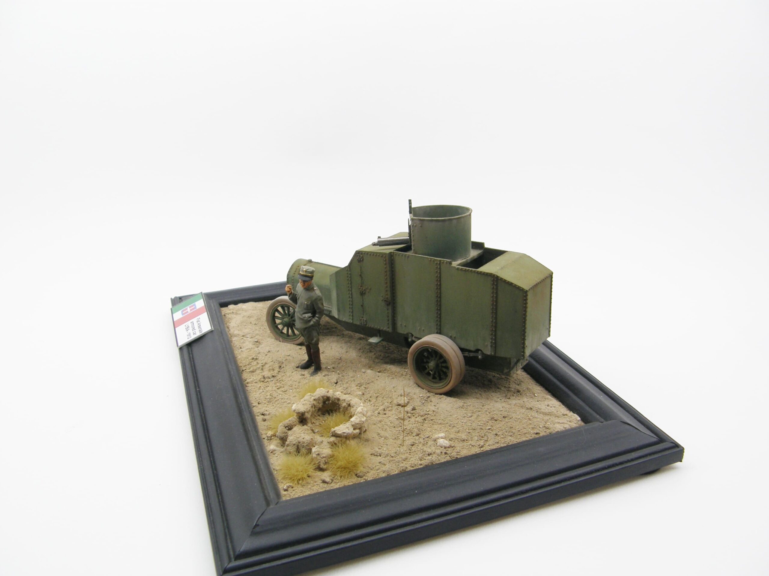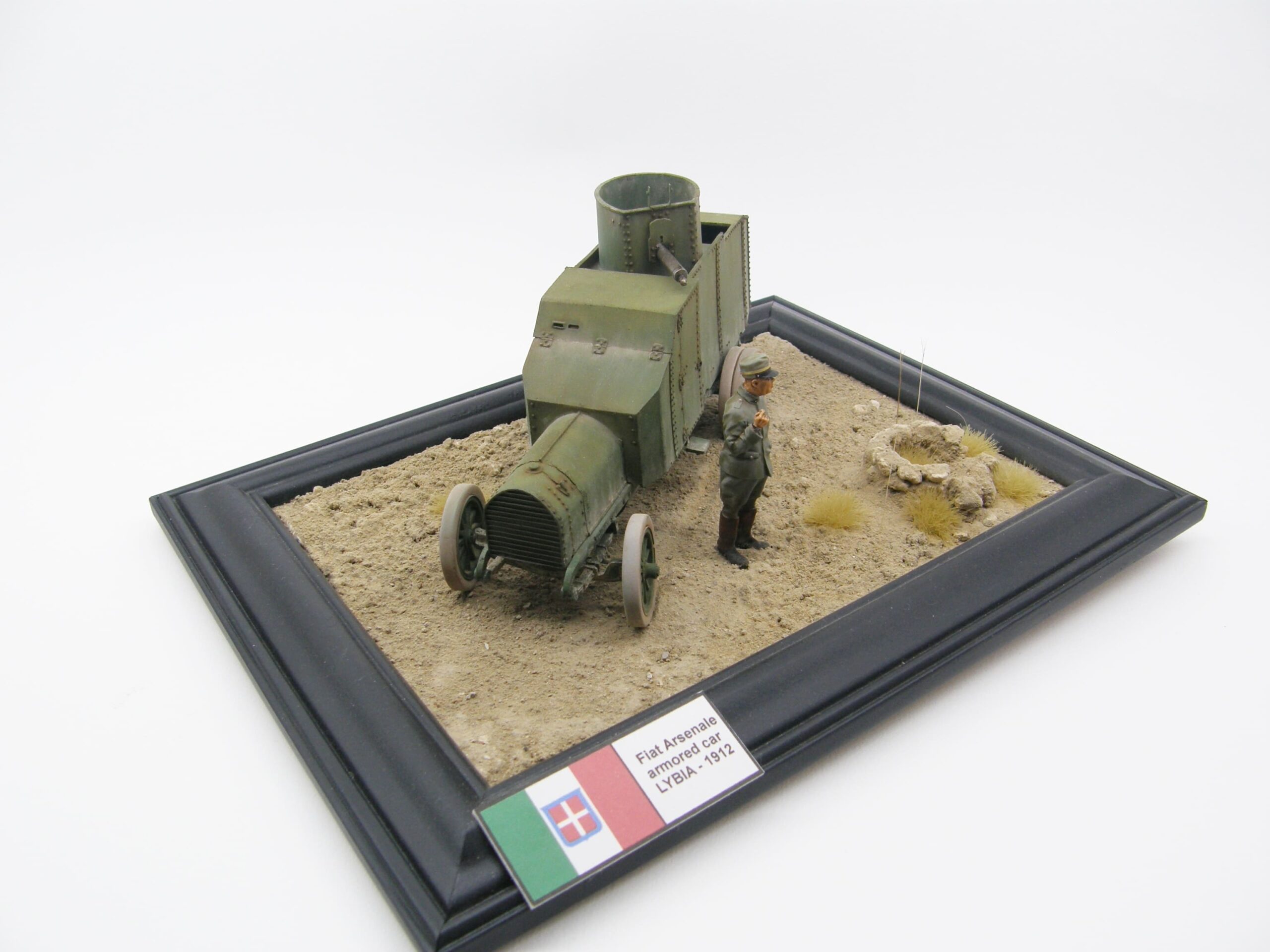 The model was formerly produced by the Italian artisan crielmodel, it was recently remoulded and can now be found on ebay. The quality of the remoulding is very good, there is as often with resin models quite few parts which allows a quick assembly. Only the support for the searchlight has been added and the machine gun slightly modified. The figure is a « the bodi russian officer » reference which has been reworked to match the Italian uniforms of the time (artillery). Indeed, since the arsenal fiat was built by the artillery arsenal of Turin, it remains under the control of artillery during the Libya campaign.